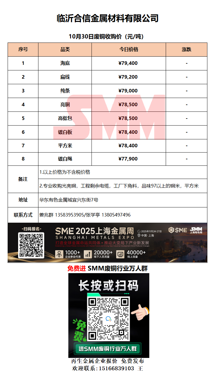 今日临沂合信金属 废铜采购报价已更新,有货的朋友欢迎联系我们!