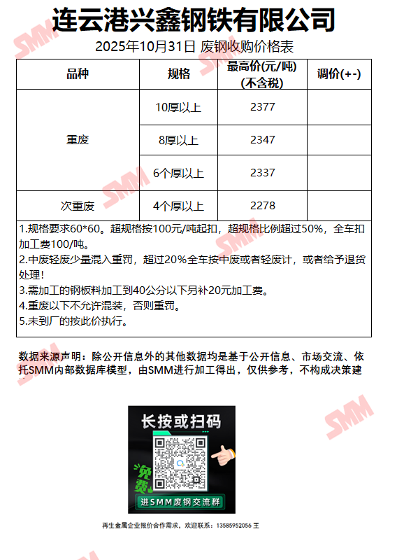 10月31日连云港兴鑫 废钢收购报价