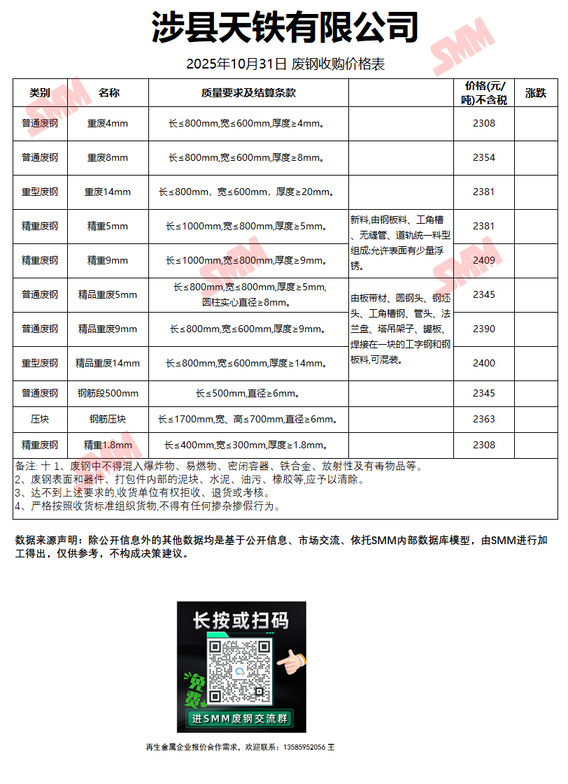 10月31日涉县天铁 废钢收购报价