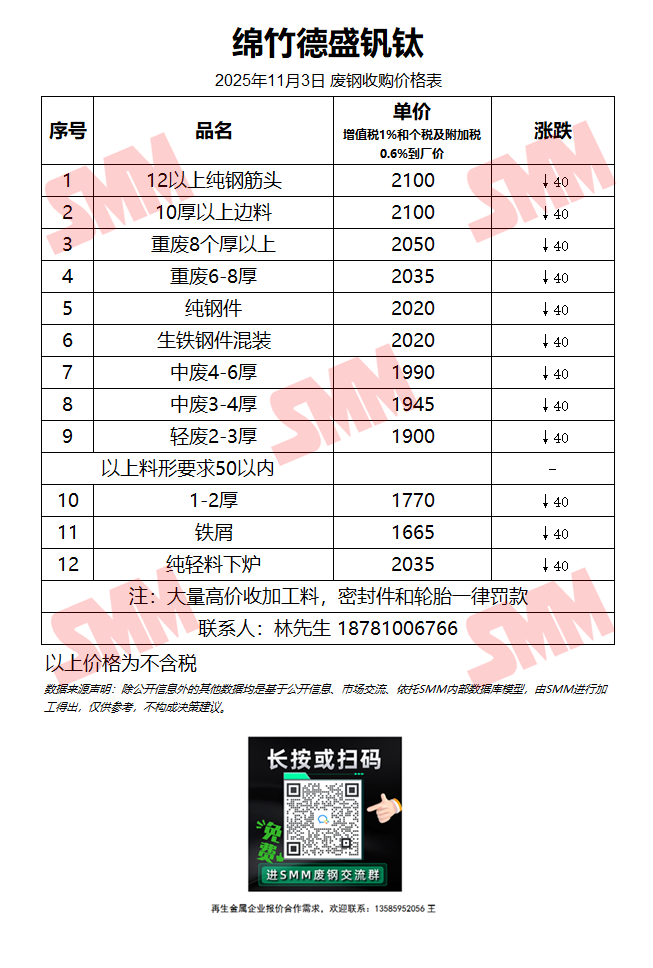 11月3日绵竹德盛钒钛 废钢收购报价