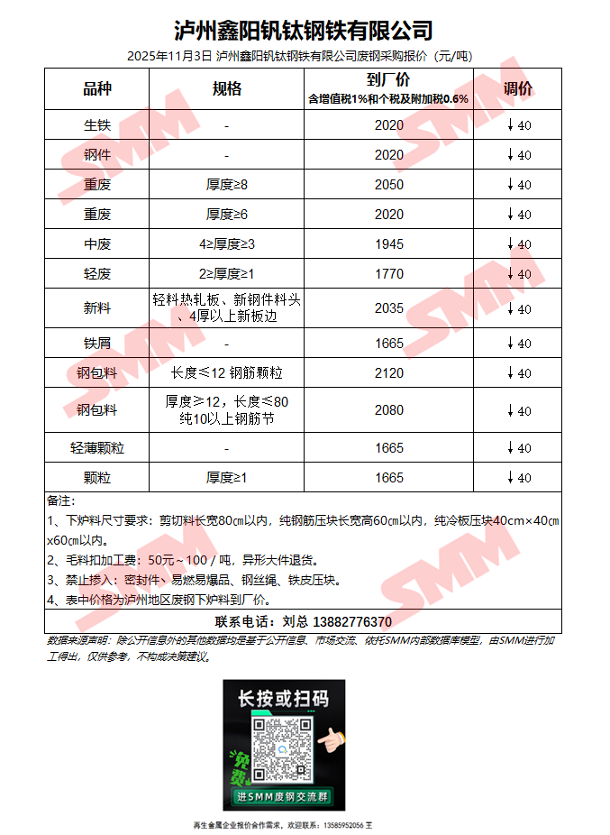 11月3日泸州鑫阳钒钛 废钢采购报价