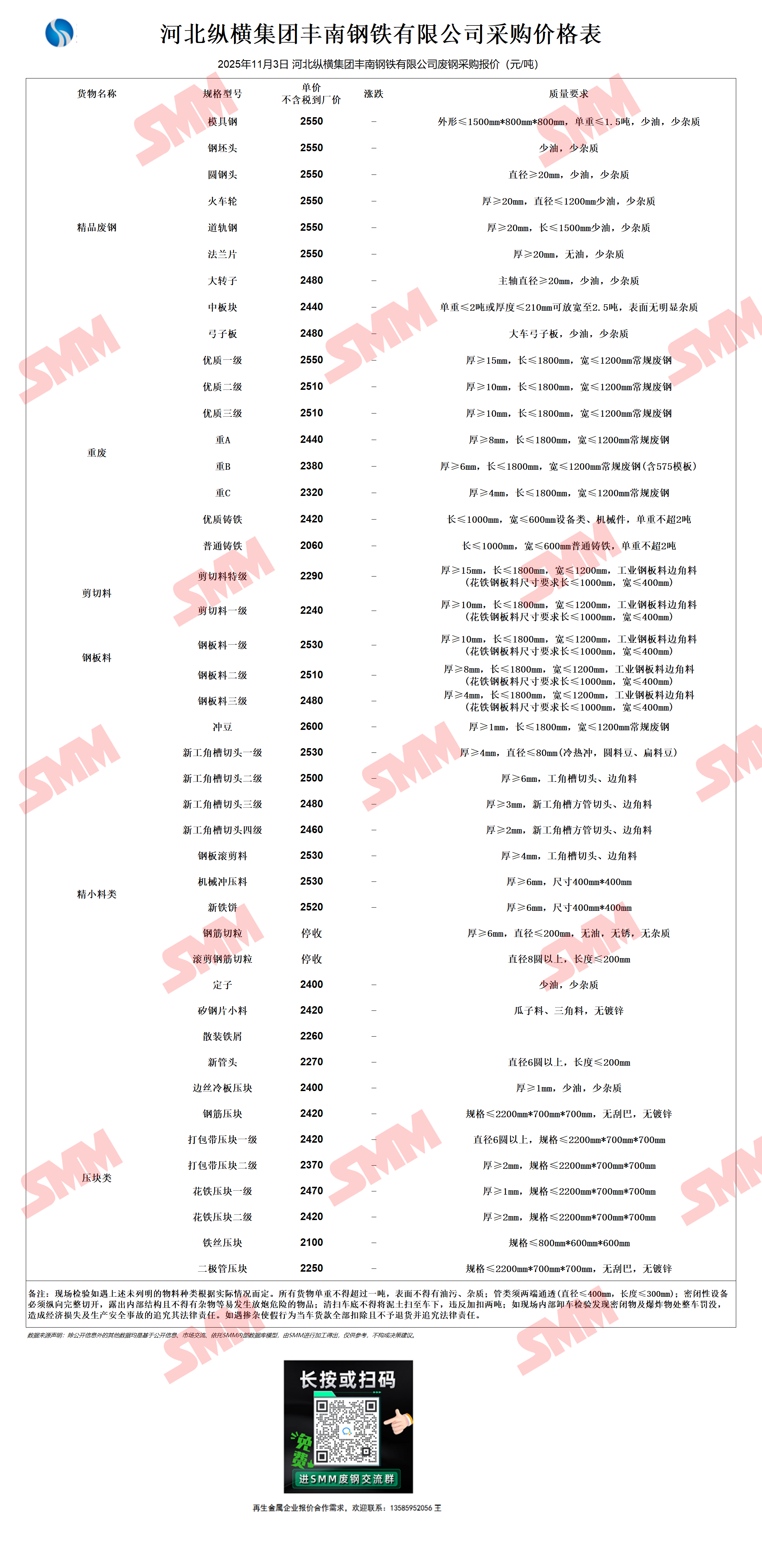 11月3日河北纵横集团丰南钢铁 废钢采购报价