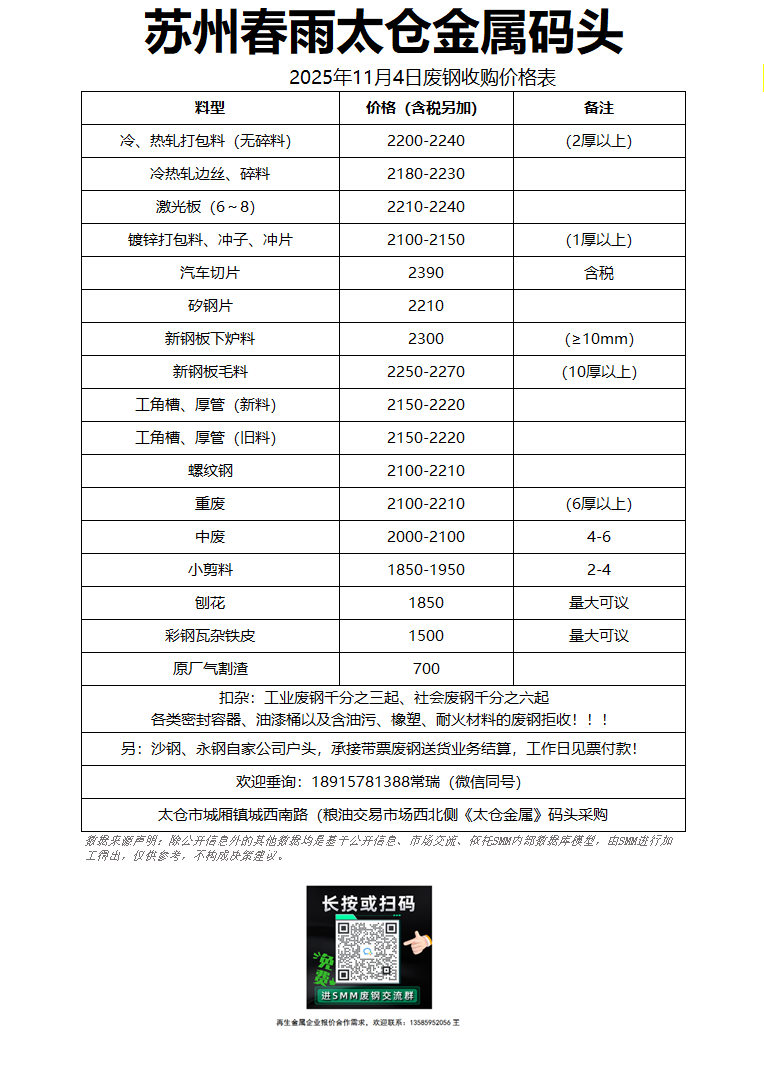 11月4日苏州春雨 废钢收购报价