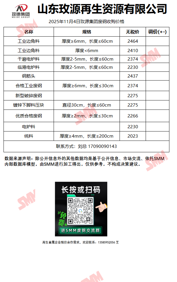 今日山东玫源再生 废钢收购报价已更新,有货的朋友欢迎联系我们!