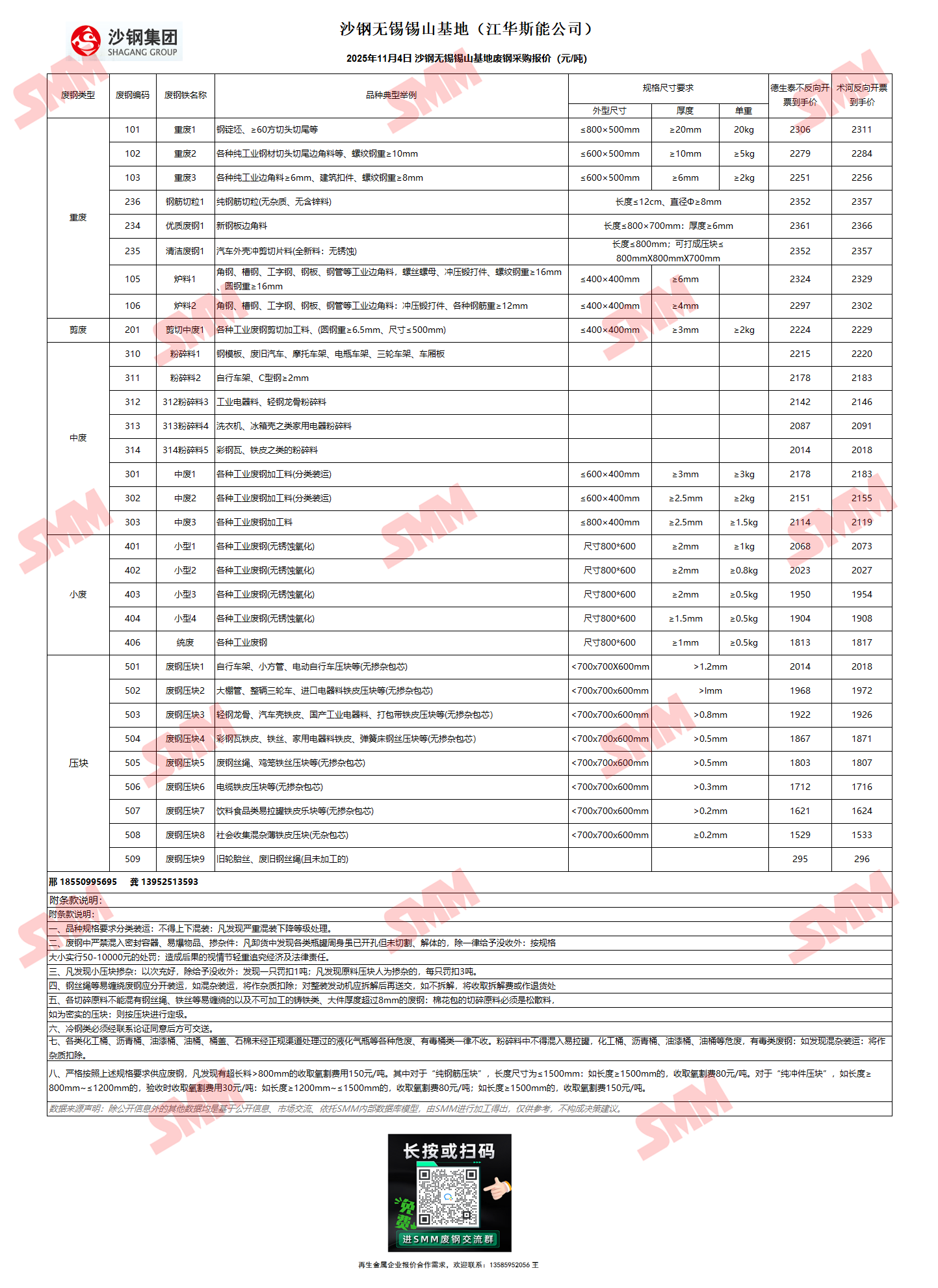 11月6日江苏鸿泰钢铁 废钢收购报价