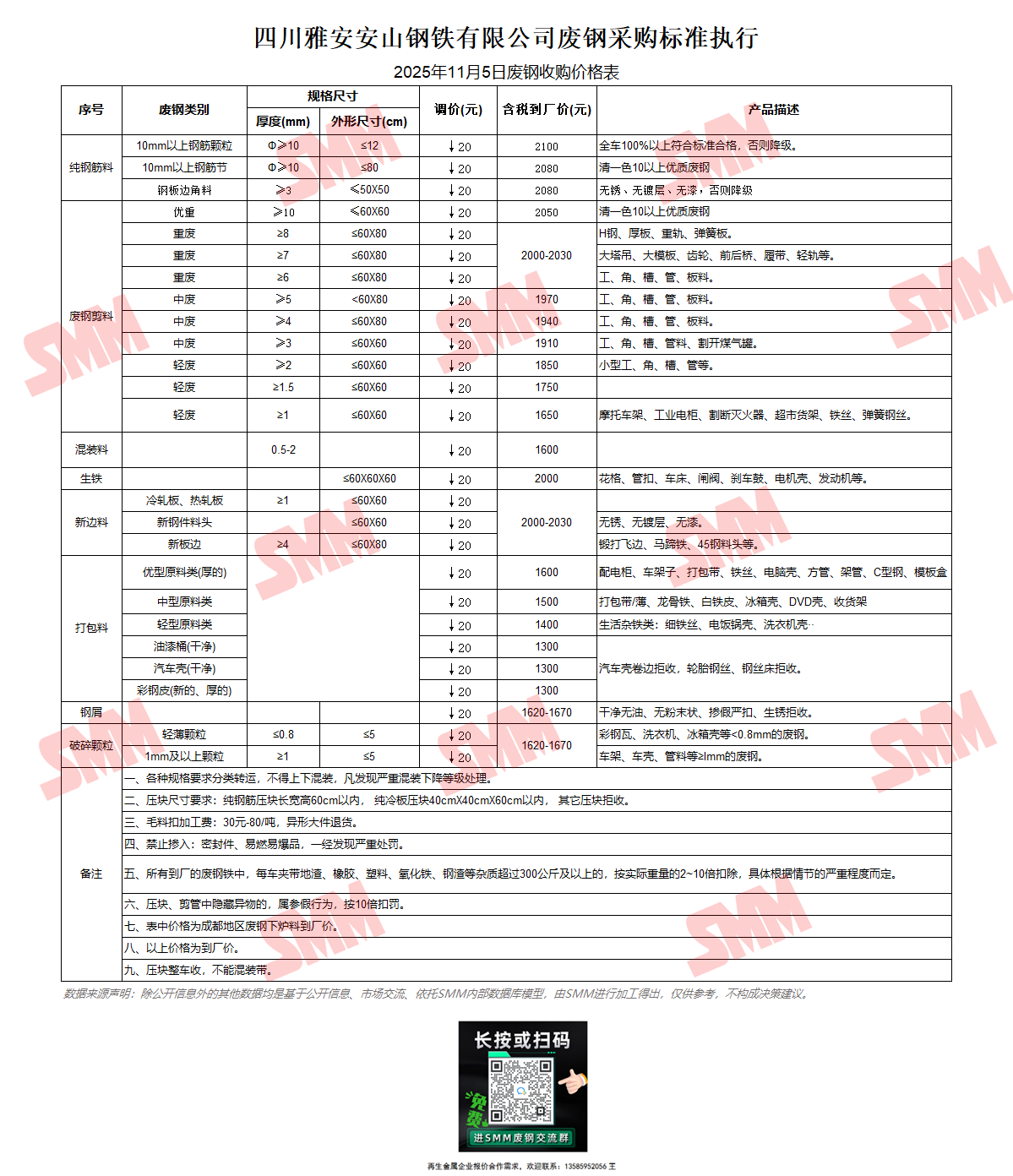 11月5日鑫泉钢铁(原绵竹金泉钢铁) 废钢采购报价