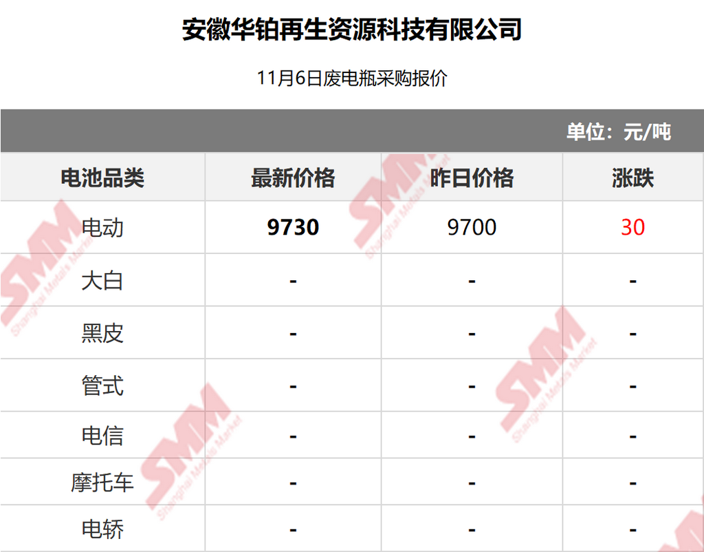 SMM 2025/11/6 国内知名再生铅企业废电瓶采购报价