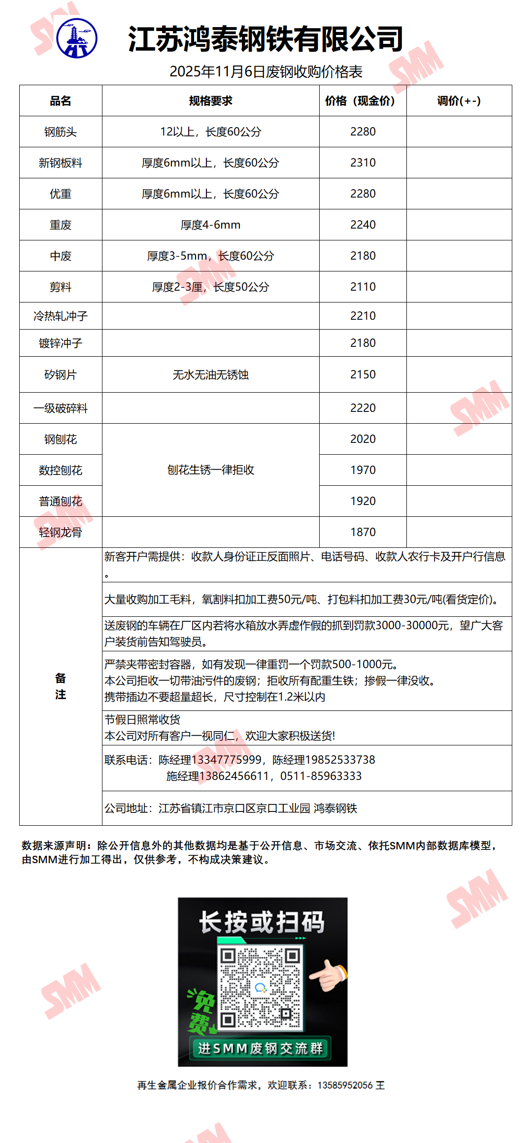11月6日江苏鸿泰钢铁 废钢收购报价