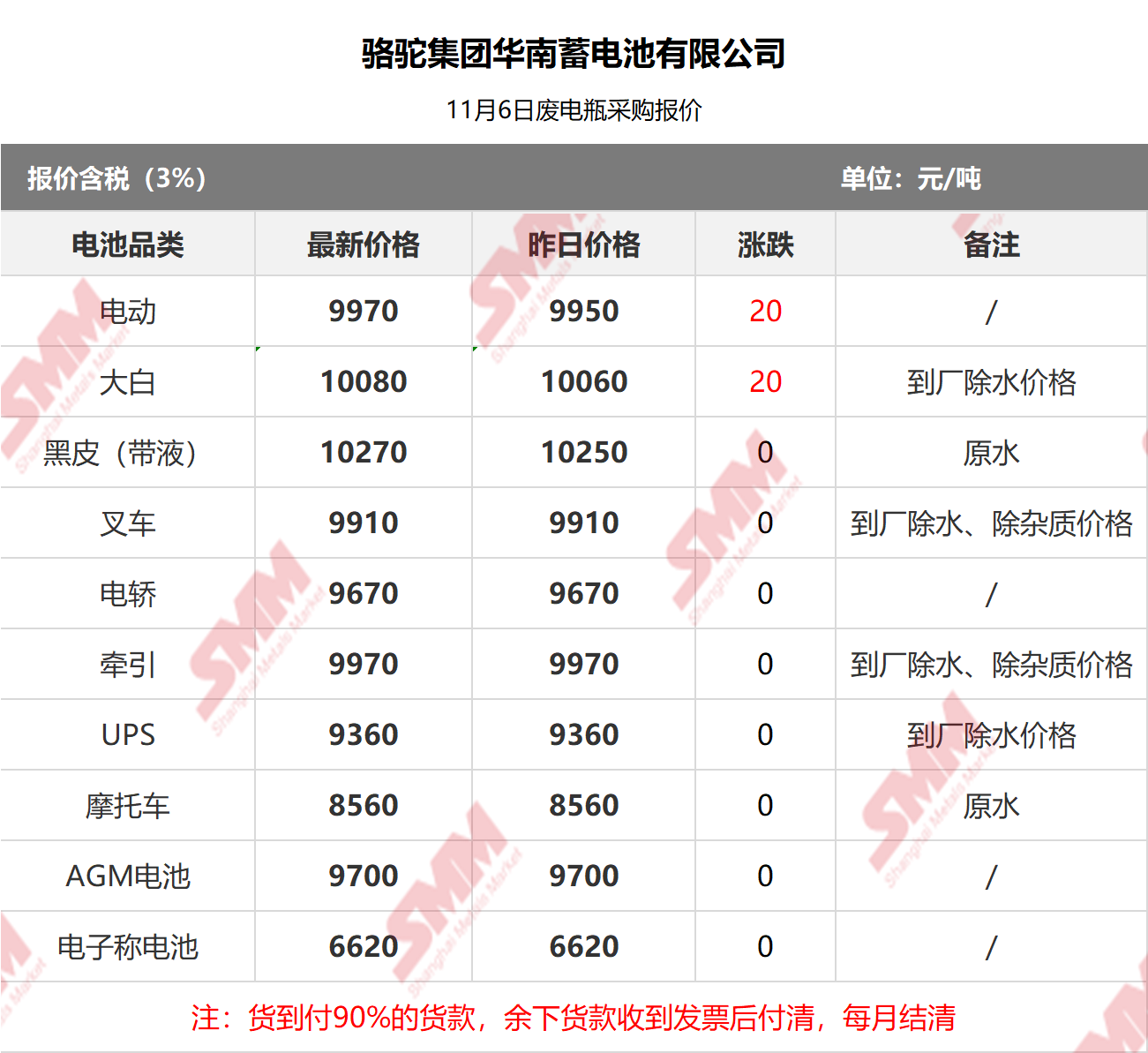 SMM 2025/11/6 国内知名再生铅企业废电瓶采购报价