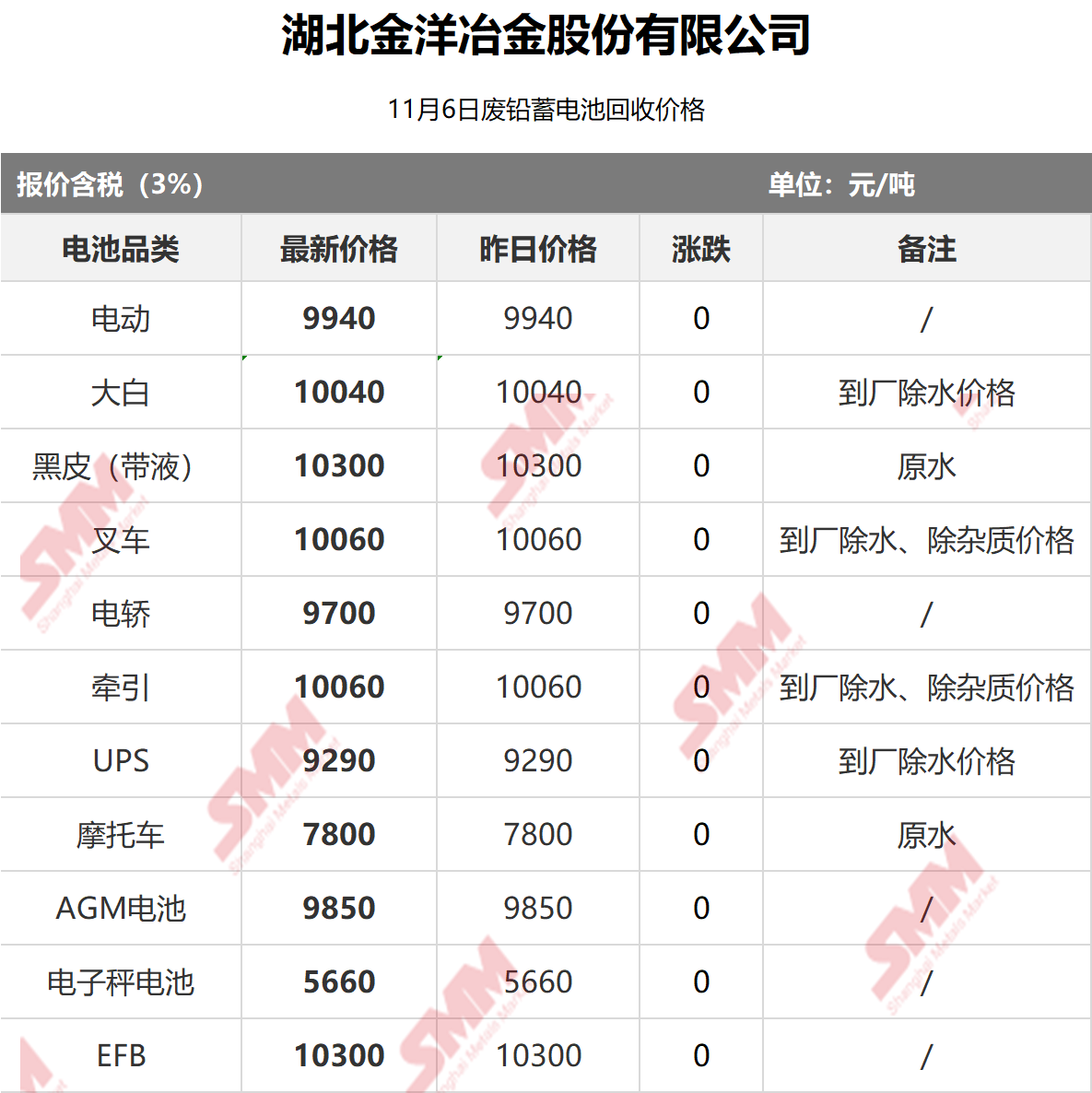 SMM 2025/11/6 国内知名再生铅企业废电瓶采购报价