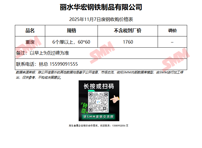 11月7日丽水华宏 废钢收购报价