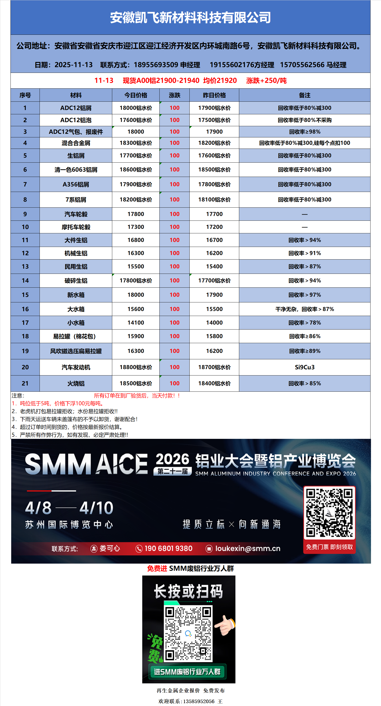 11月13日安徽凯飞 废铝采购报价