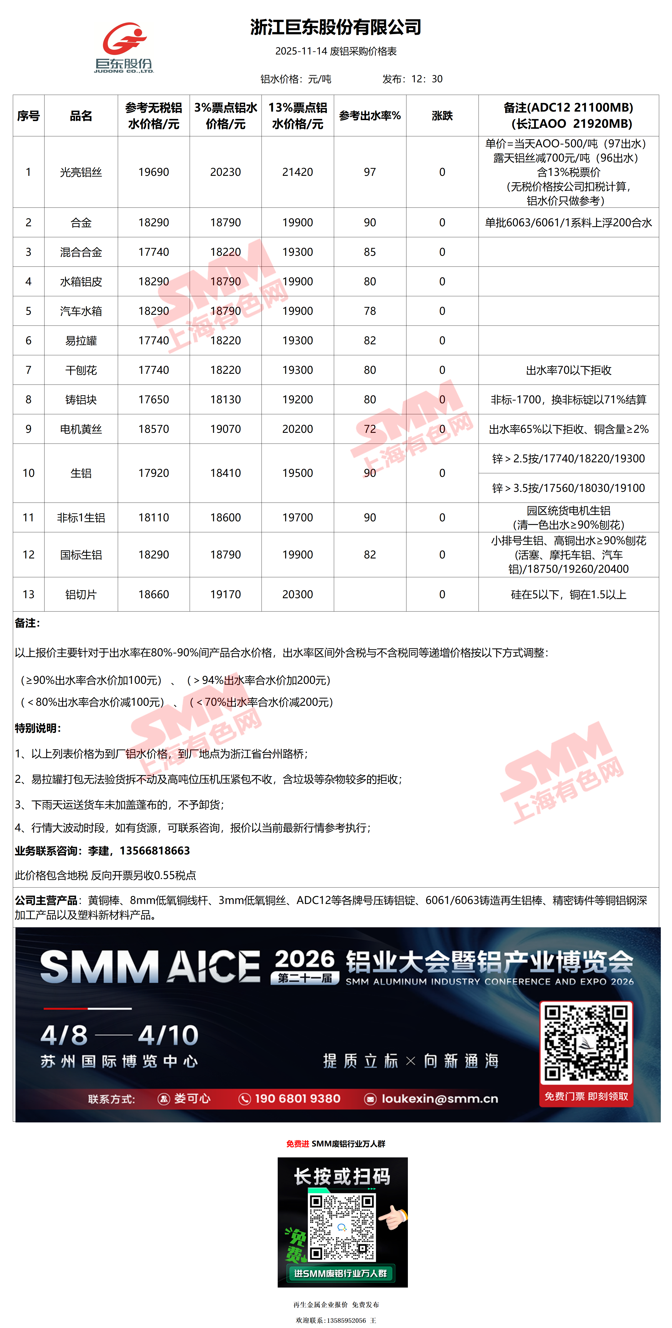 11月14日浙江巨东 废铝采购报价