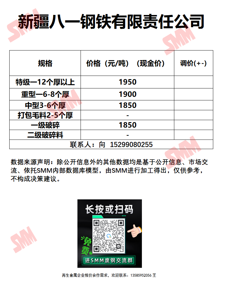 今日新疆八一钢铁 废钢收购报价已更新,有货的朋友欢迎联系我们!