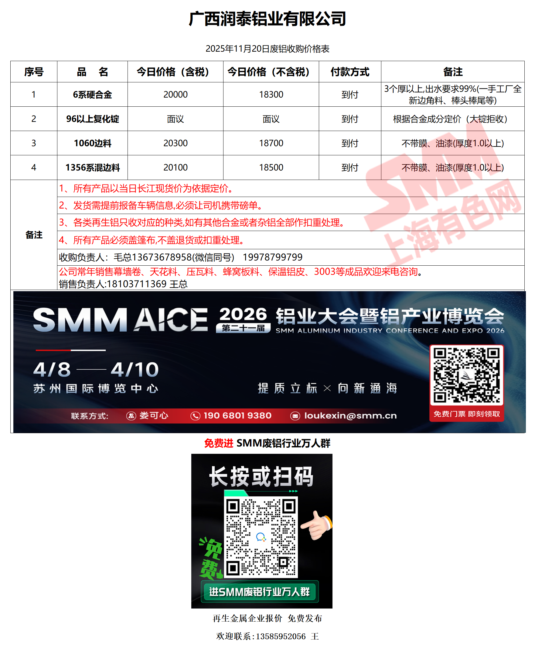 今日广西润泰铝业 废铝采购报价已更新,有货的朋友欢迎联系我们!