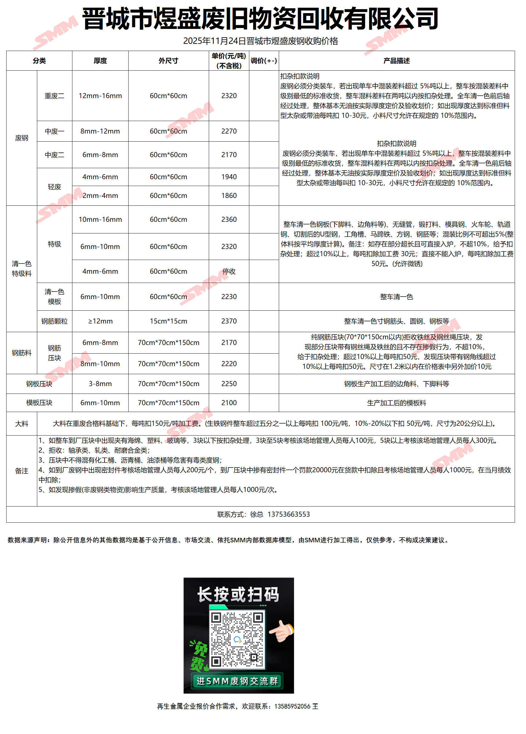 11月24日晋城市煜盛 废钢收购报价
