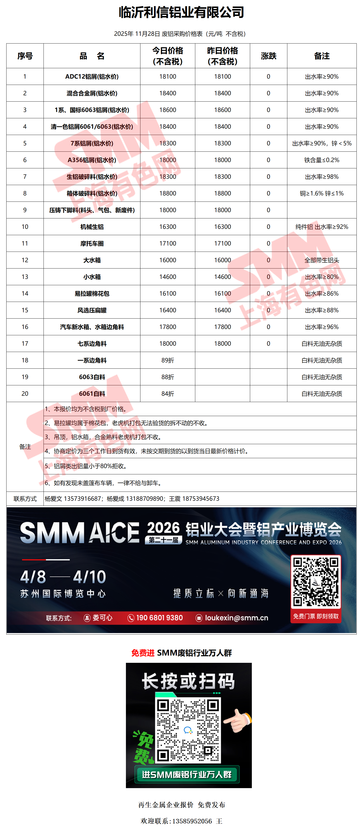今日临沂利信 废铝采购报价已更新,有货的朋友欢迎联系我们!