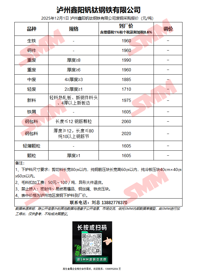 12月1日泸州鑫阳钒钛 废钢采购报价