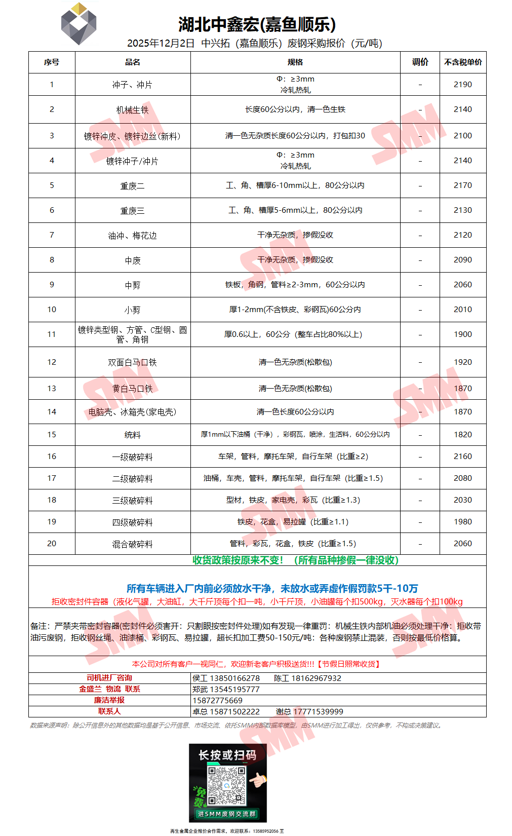 12月2日湖北中鑫宏(嘉鱼顺乐) 废钢采购报价