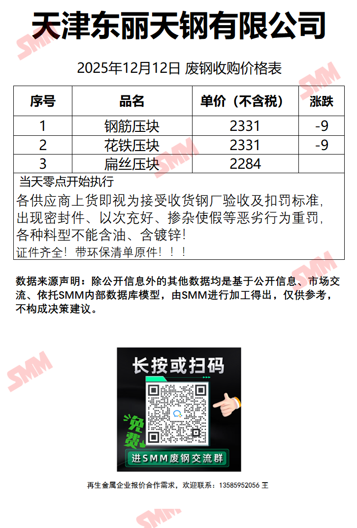 12月12日天津东丽天钢 废钢收购报价