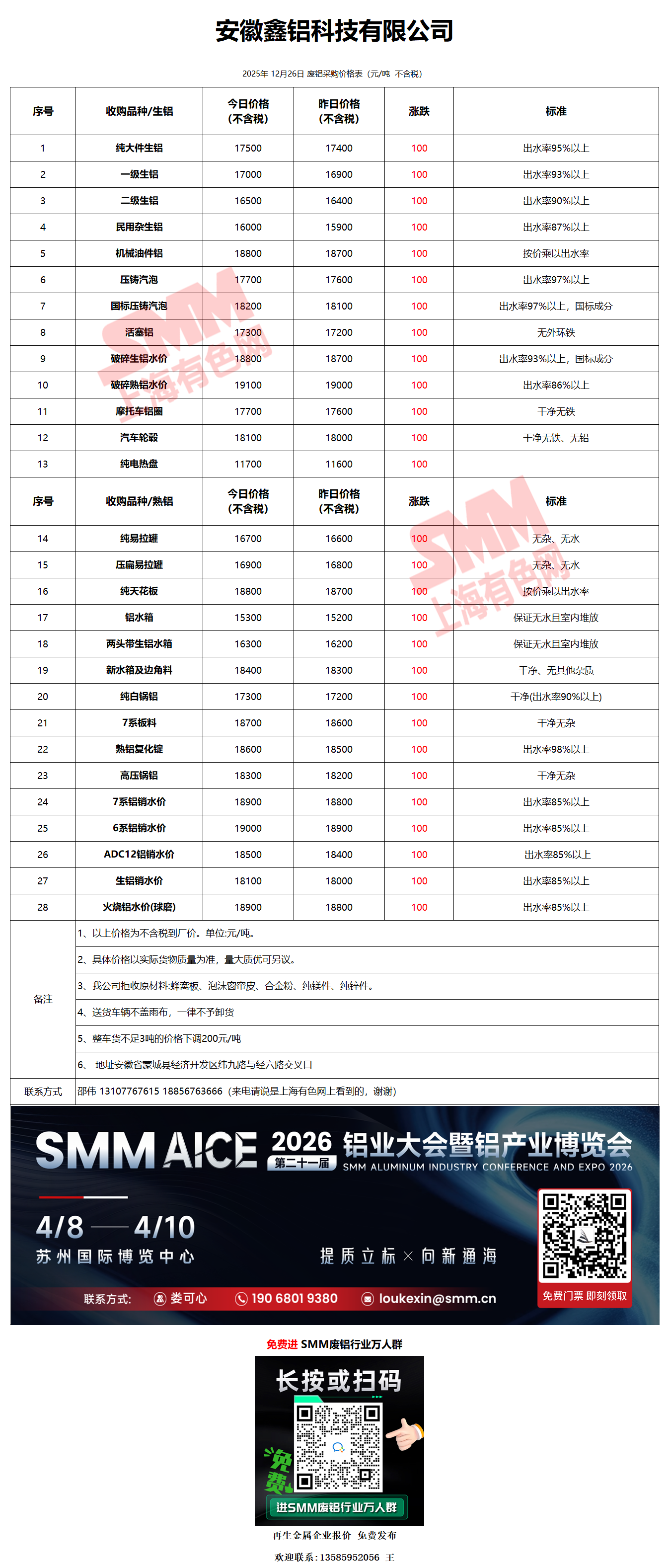 今日安徽鑫铝 废铝采购报价已更新,有货的朋友欢迎联系我们!