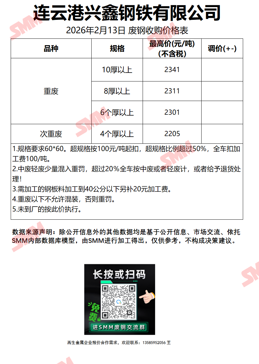 2月13日连云港兴鑫 废钢收购报价