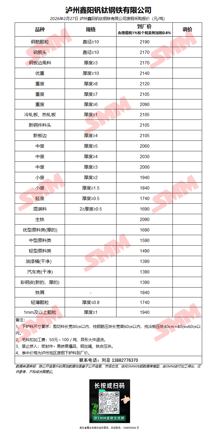 2月27日泸州鑫阳钒钛 废钢采购报价