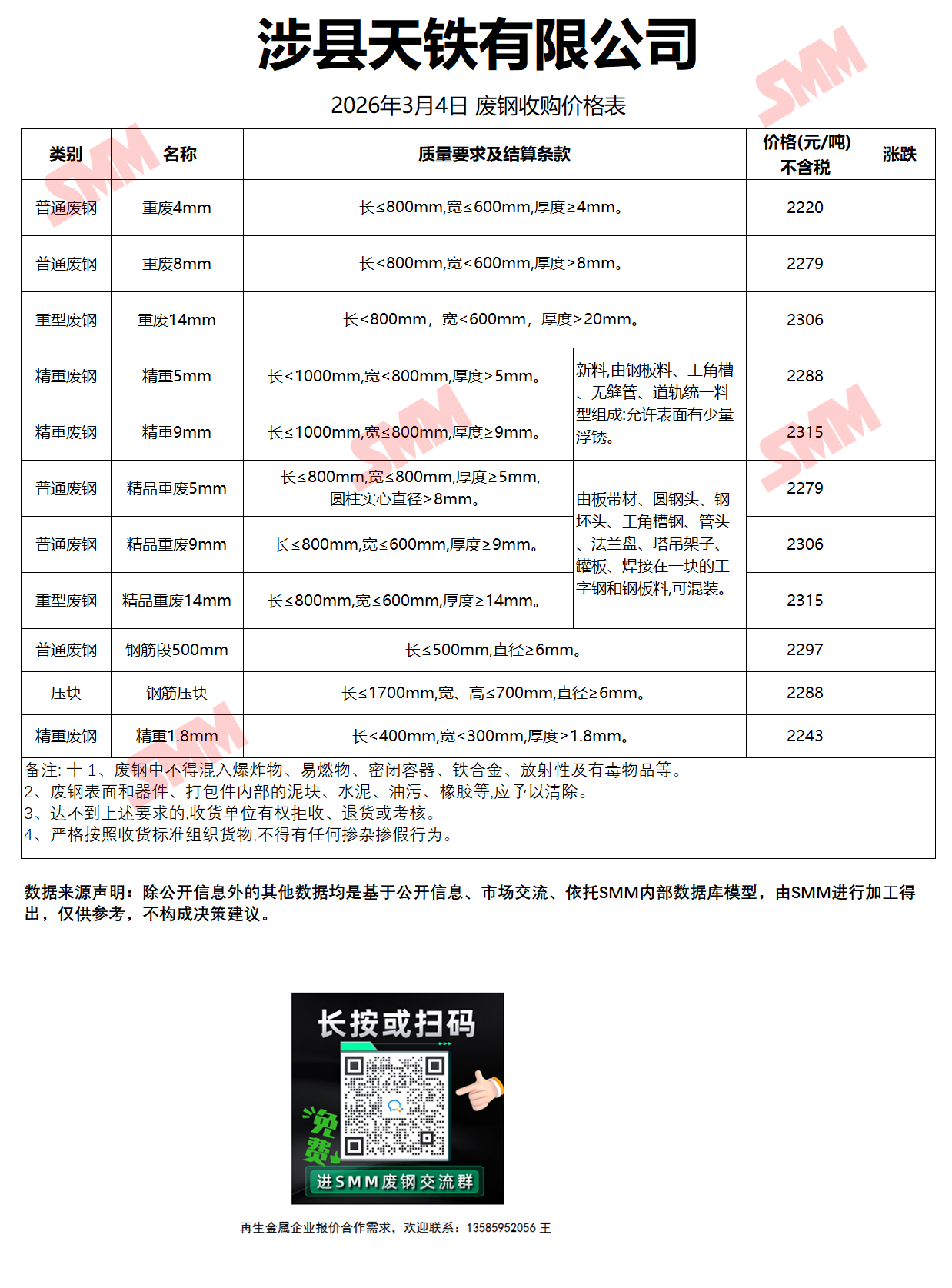 3月4日涉县天铁 废钢收购报价