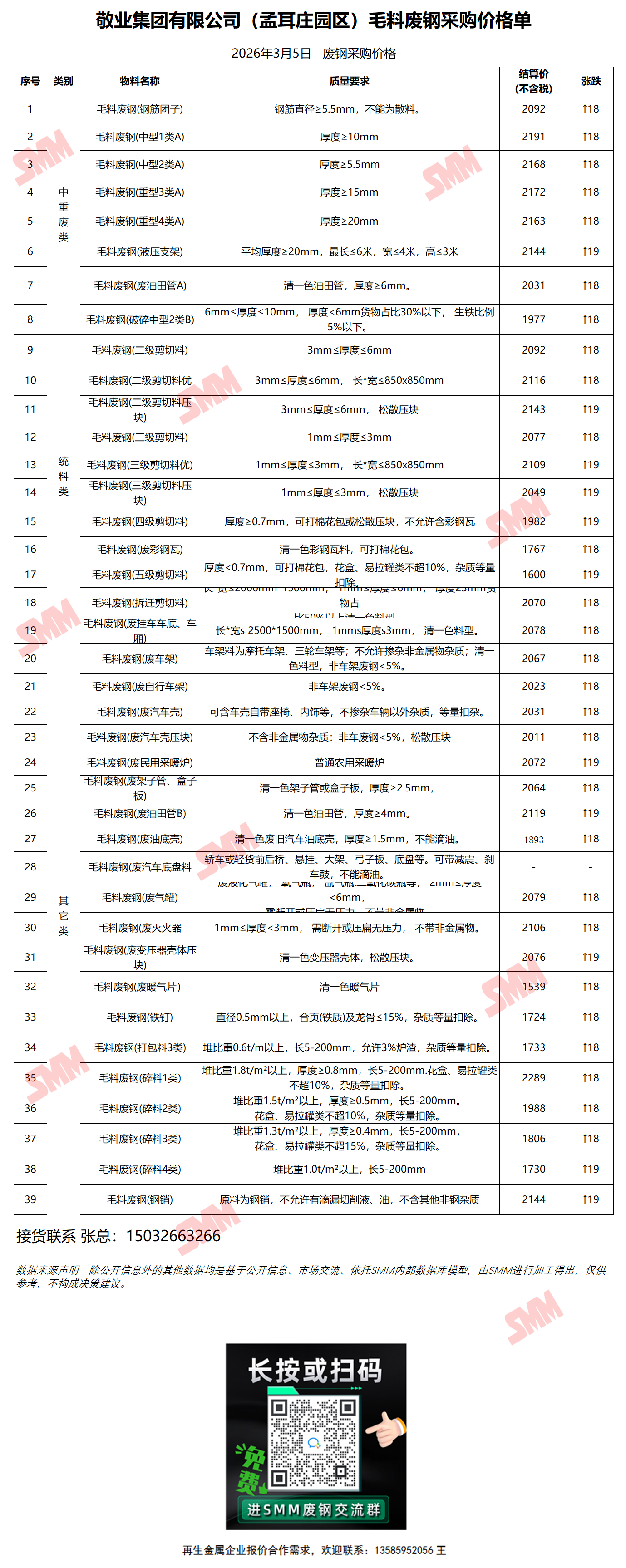 3月5日敬业钢铁(孟耳庄园区) 废钢采购报价
