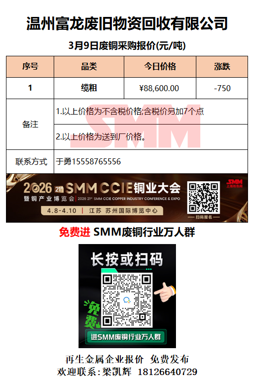 3月9日温州富龙废旧 废铜采购报价