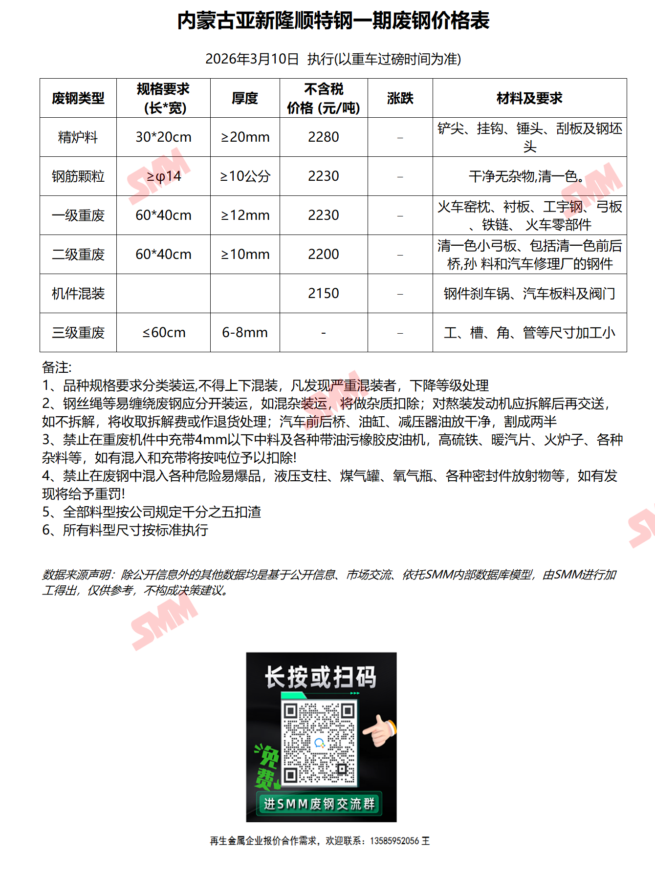 3月10日内蒙古亚新隆顺特钢一期 废钢收购报价