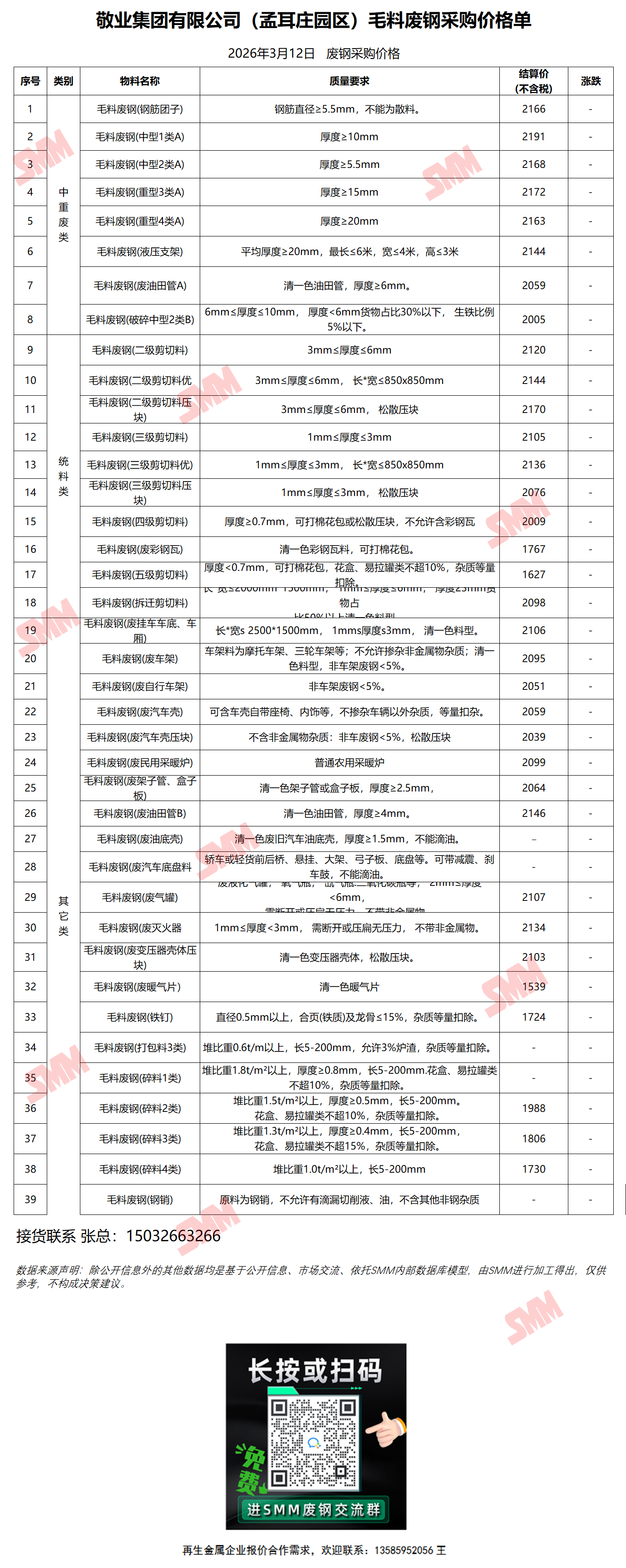 3月12日敬业钢铁(孟耳庄园区) 废钢采购报价