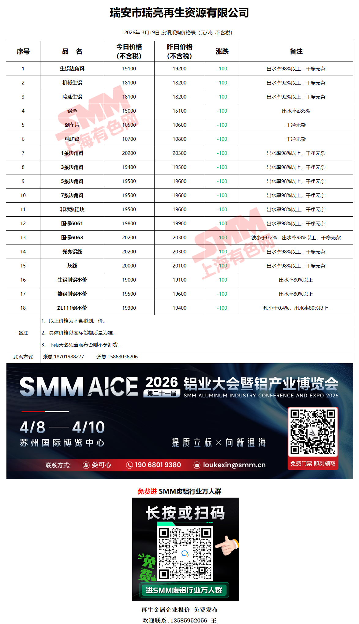 3月19日瑞格金属 废铝采购报价