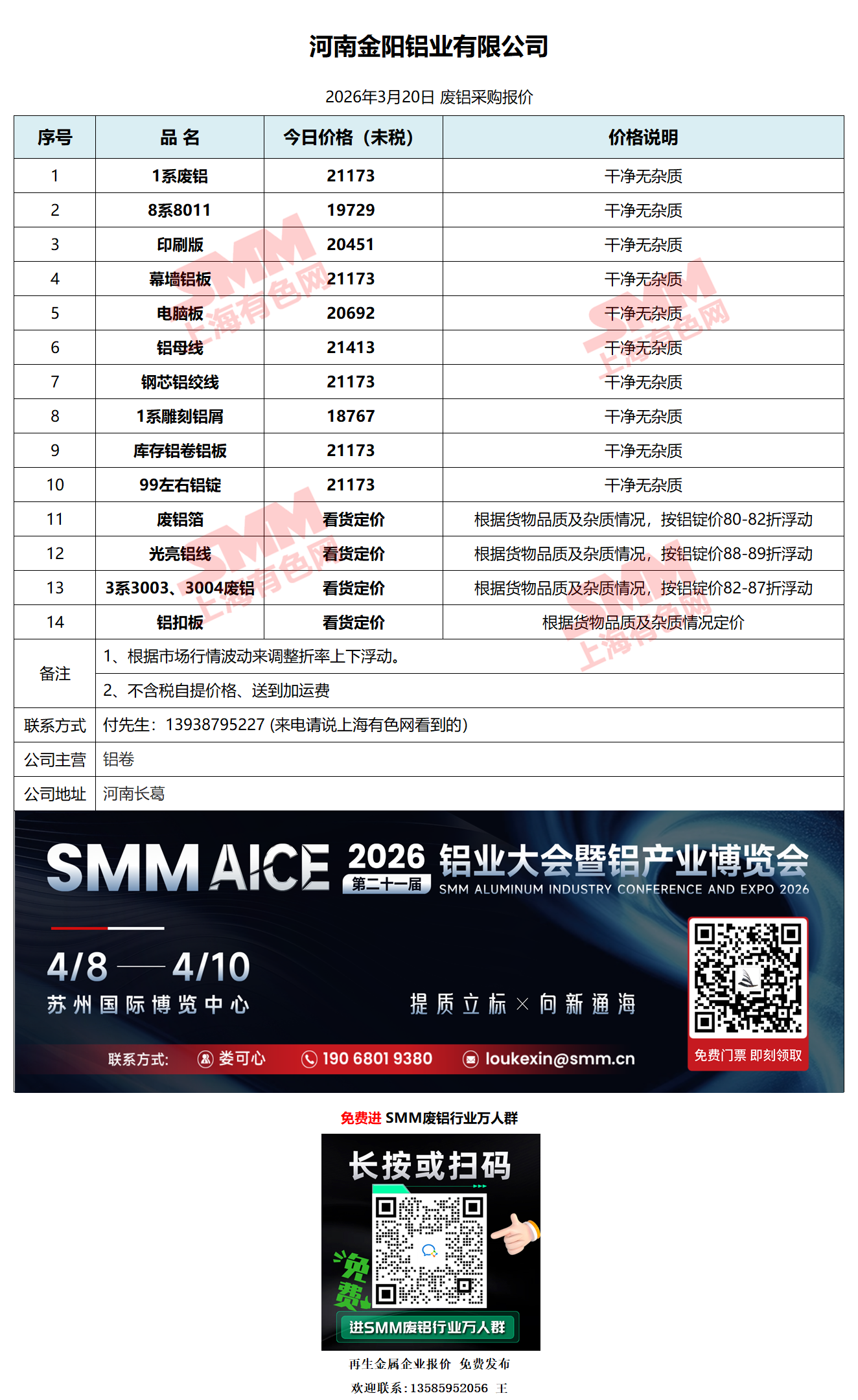 3月20日河南金阳铝业 废铝采购报价