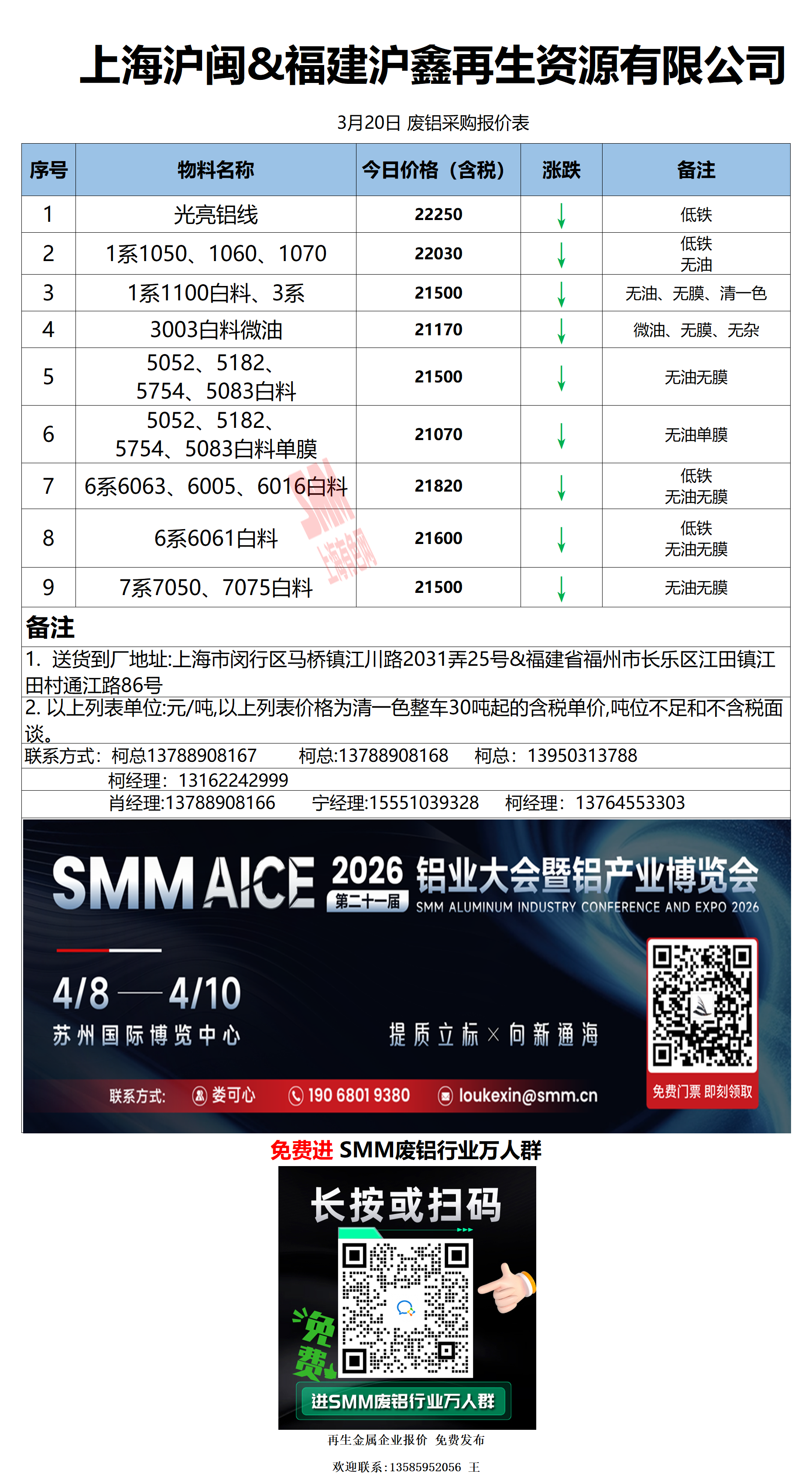 3月20日上海沪闽&福建沪鑫 废铝采购报价