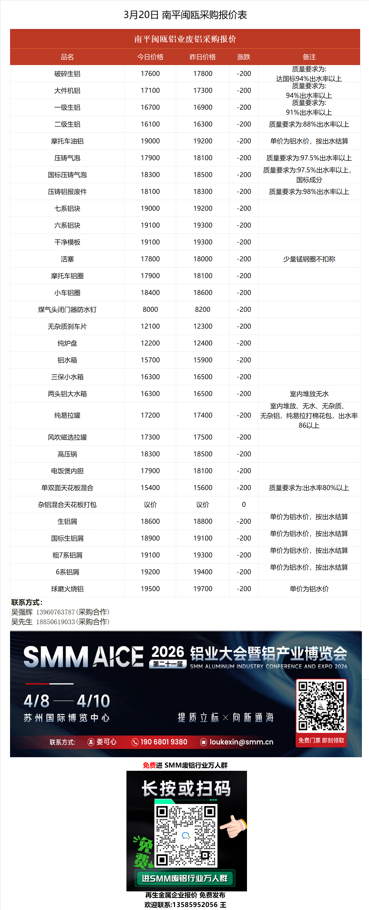 3月20日南平闽瓯 废铝采购报价