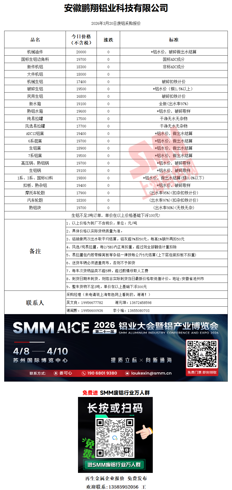 今日安徽鹏翔 废铝采购报价已更新,有货的朋友欢迎联系我们!
