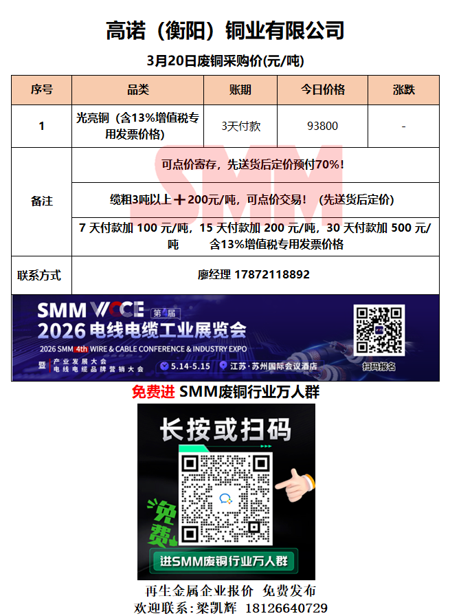 3月20日高诺(衡阳)铜业 废铜采购报价