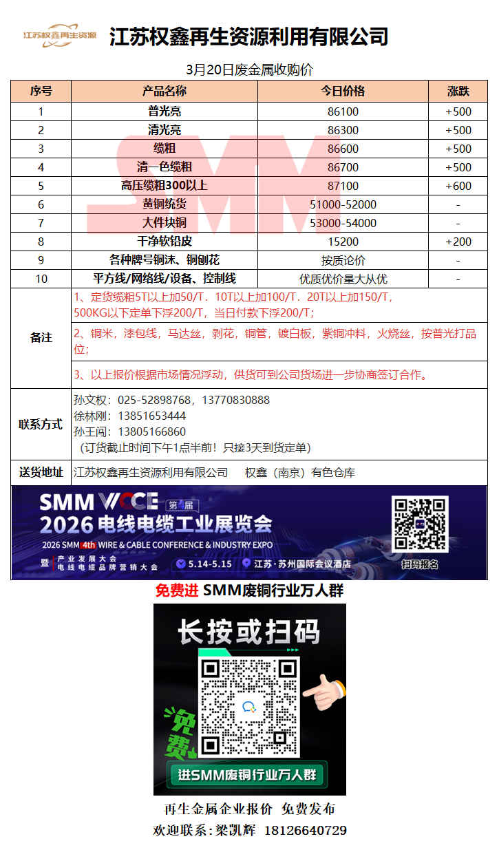 3月20日江苏权鑫 废铜采购报价