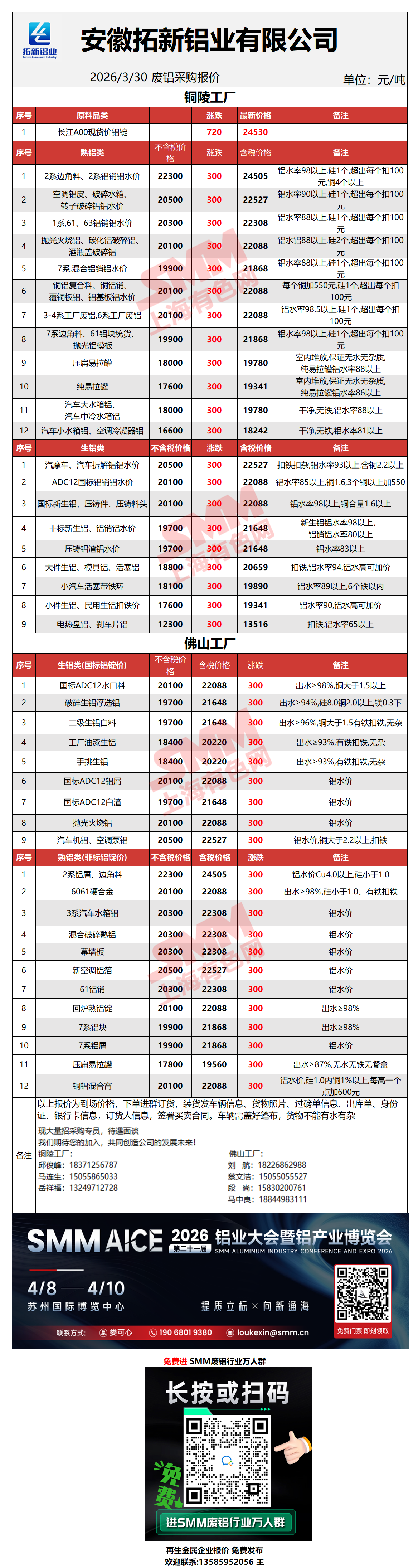 3月30日拓新铝业 废铝采购报价