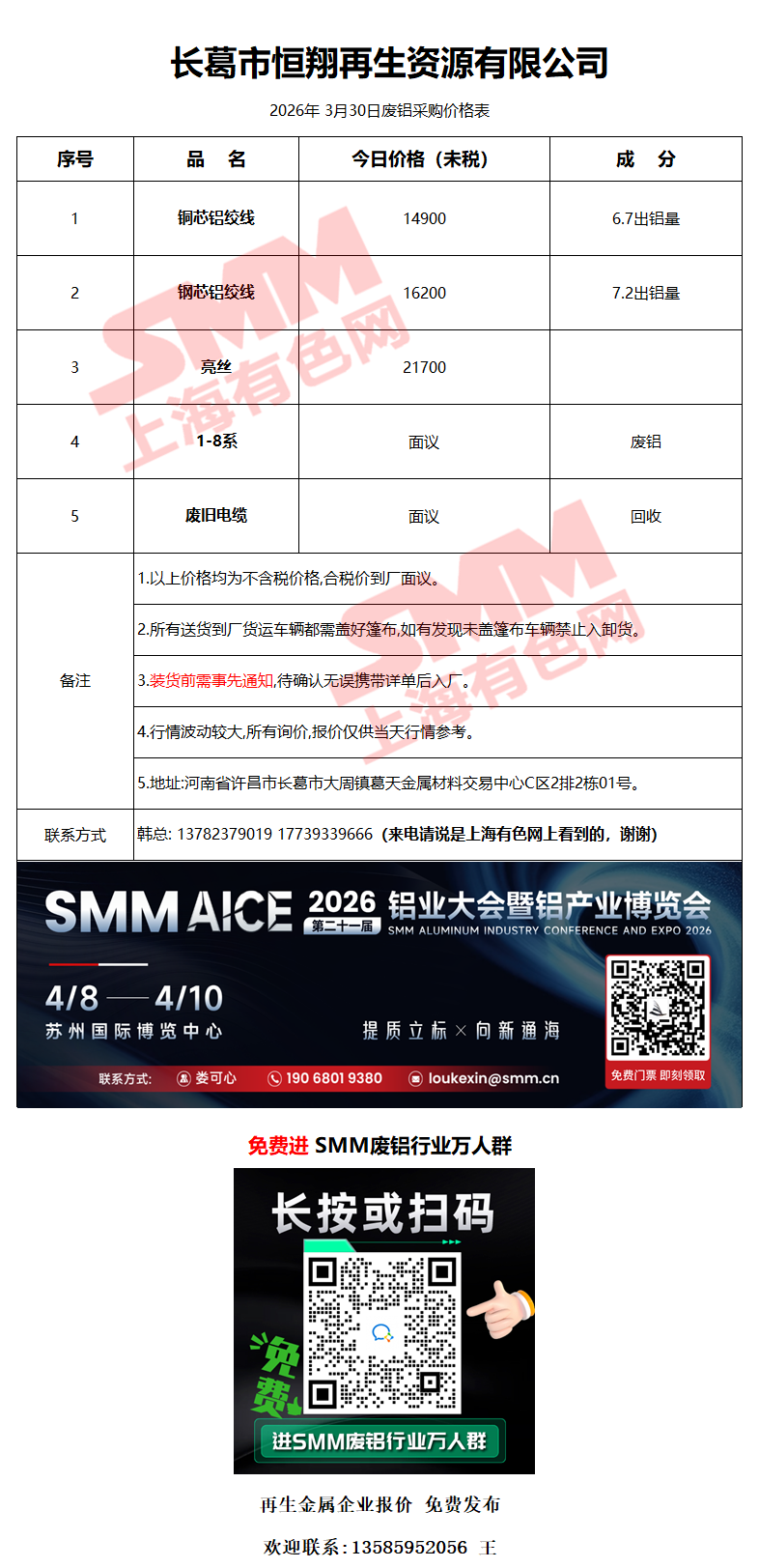 3月30日长葛恒翔 废铝采购报价