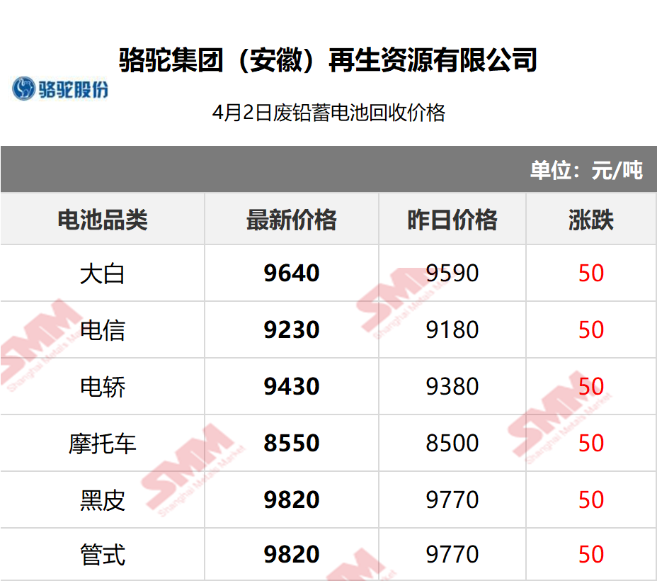 SMM 2026/4/2 国内知名再生铅企业废电瓶采购报价