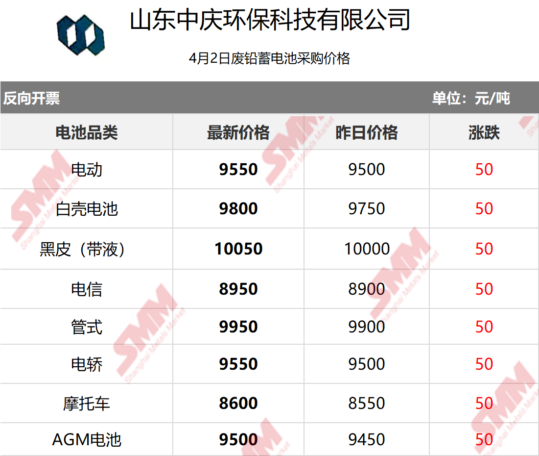 SMM 2026/4/2 国内知名再生铅企业废电瓶采购报价