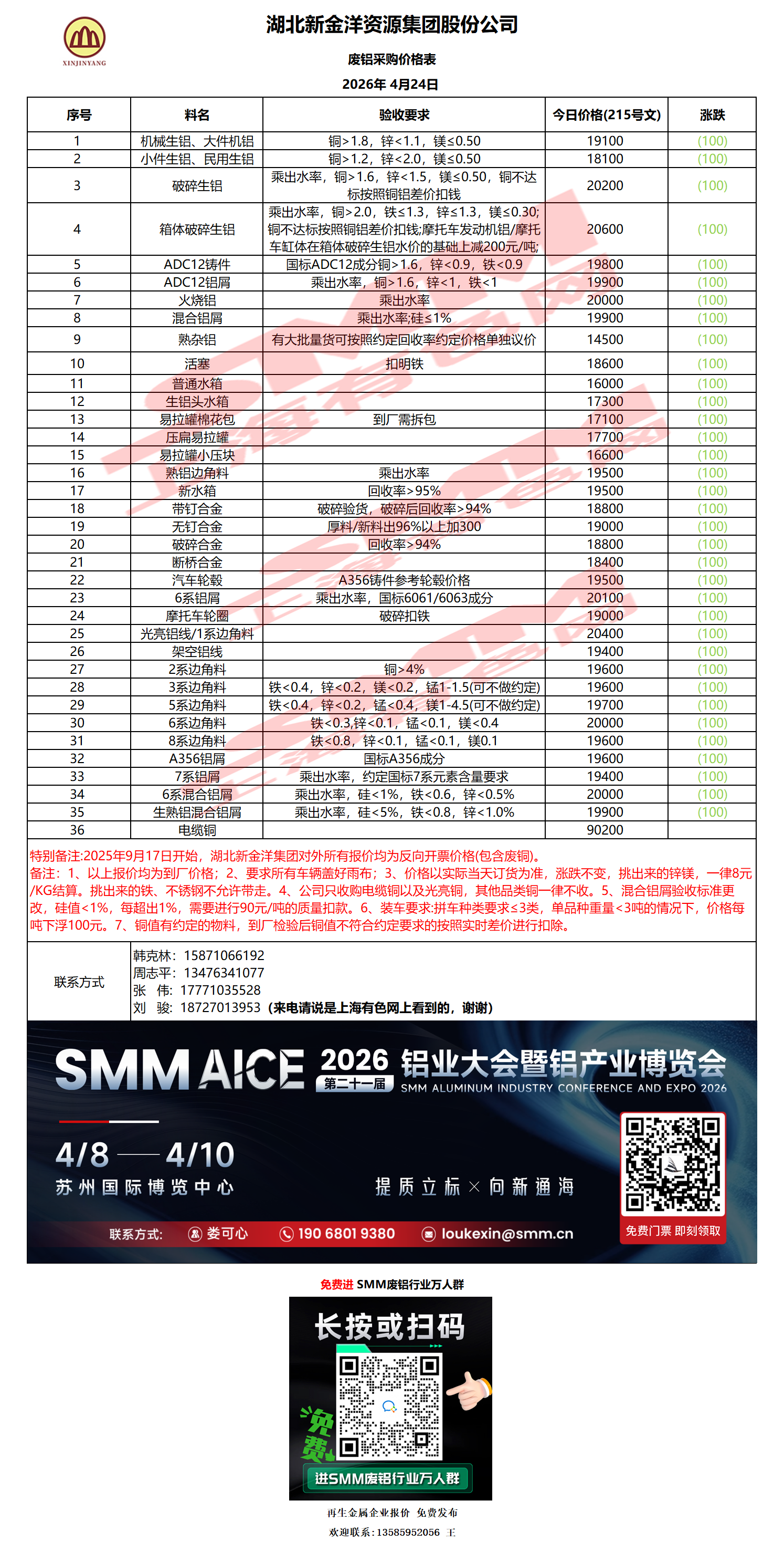 4月24日拓新铝业 废铝采购报价