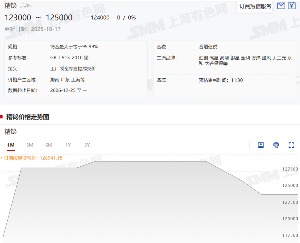 SMM10月17日讯:本周铋市场价格弱势下行态势明显。虽然十一刚过,但市场需求目前依旧没有表现出旺季状态,十一厂家之后的市场来看整体市场成交一般,买卖双方交易兴致依旧不高,特别是下游备货意愿一般,近期市场某南方厂家的铋锭招标尝试最终成交价格也不高,也使得市场信心受到一些影响。不少市场人士依旧表示,目前供需双弱的格局还是依旧,原料方面依旧紧缺,供应方面依旧吃紧,厂家的产量也有明显下降趋势,市场的库存也没有明显增加。但不少市场人士称,由于近期贵金属市场价格暴涨,资金流动转向了贵金属市场,铋金属市场的投机力量消失,价格走弱也使得终端的买兴减少,铋市场价格下滑也在情理之中。短期来讲,在当前的供求格局下,市场观望情绪浓厚还将是主旋律,不少市场人士对市场价格短期依旧持担忧态度。截至本周末SMM铋锭主流价格123000-125000元/吨。