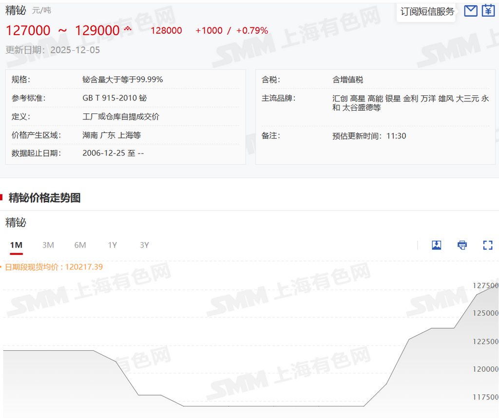 SMM11月28日讯:本周铋市场价格继续回升,市场整体交易开始转为活跃,市场人士对价格看涨情绪转浓,认为12月份临近年底终端备货将增加,且由于今年春节较晚,市场远期来看价格有继续上升可能。目前特别是投机市场交易积极性开始增加。不少市场人士依旧表示,目前供需格局开始转变,原料方面依旧紧缺,供应方面依旧吃紧,厂家的产量也没有明显增加,市场的库存也没有大幅度增加,但终端需求开始有所好转,推动价格上行。截至本周末SMM铋锭主流价格127000-129000元/吨。