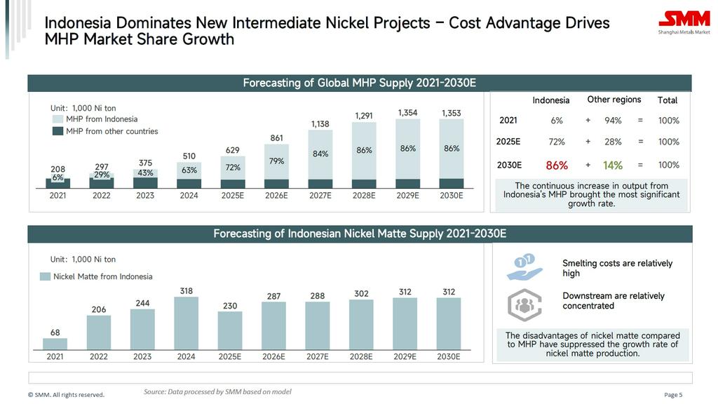 印尼已成为全球镍中间品,特别是MHP的绝对增长点。其成本优势正在挤压其他地区和高成本工艺中间品高冰镍的市场空间。印尼的MHP供应量从2021年仅20.8万镍吨,暴增至2030年预计的135.3万镍吨,其全球份额也从2021年的6% 飙升至2030年预计的86%。