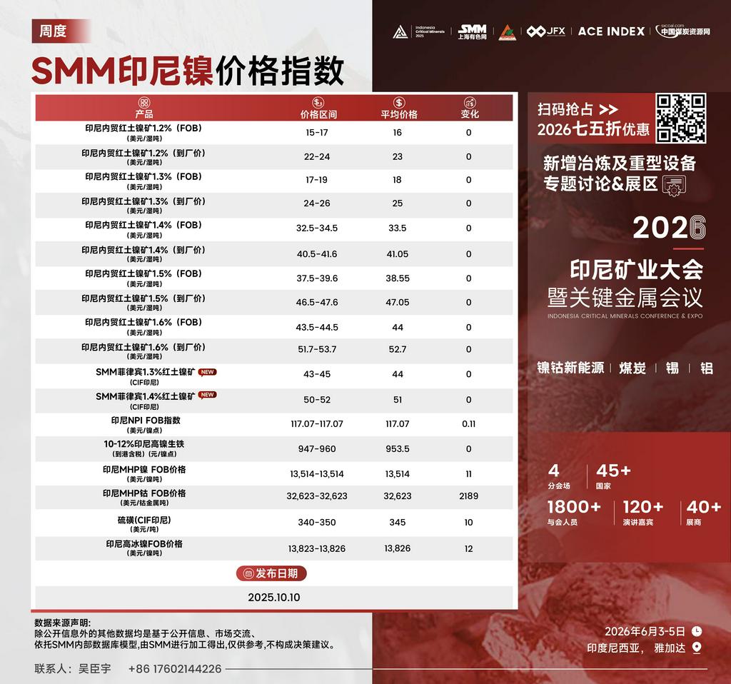十月初,印尼镍矿价格有所上行。基准价方面,印尼内贸镍矿基准10月上半期为15,102美元/干吨,较上一期增了0.68%。升水方面,据SMM印尼内贸红土镍矿的升水数据,1.4%品位均幅为22 美元,1.5%品位均幅为25.5美元, 1.6%品位均幅为26美元,主流升水涨幅为1美元。SMM印尼内贸红土镍矿1.6%到厂价格为51.7-53.7美元/湿吨。湿法矿价格方面,SMM印尼内贸红土镍矿1.3%到厂价格持稳在24-26美元/湿吨,与上周持平。