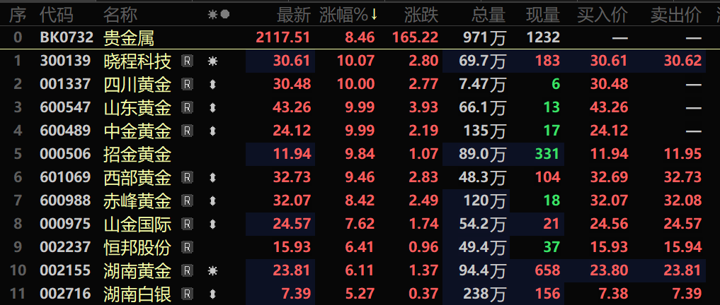 贵金属股市方面:贵金属股票10月9日出现了大幅飙升,截至10月9日14:06分左右,贵金属板块涨8.46%,个股方面:四川黄金、山东黄金以及中金黄金涨停,晓程科技涨超10%,招金黄金、西部黄金以及赤峰黄金等涨幅居前。