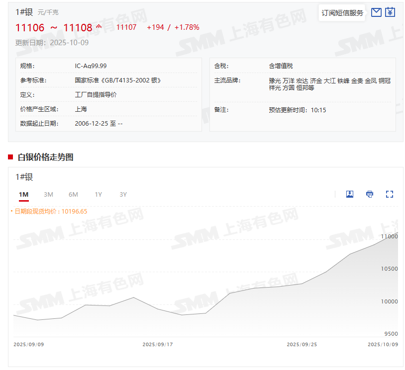 受益于海外贵金属期货双节期间的耀眼表现,沪银节后跳空高开,白银现货10月9日升破了11000元/千克,10月9日,SMM1#白银上午出厂参考均价为11107元/千克,均价较前一交易日上涨194元/千克,涨幅为1.78%。据SMM了解,上海地区大厂银锭对TD升水8-10元/千克或对沪期银2512合约贴水55元/千克少量成交,因基差走扩部分持货商惜售观望,下游普遍谨慎观望,刚需为主,接货意向偏低,实际成交寡淡。